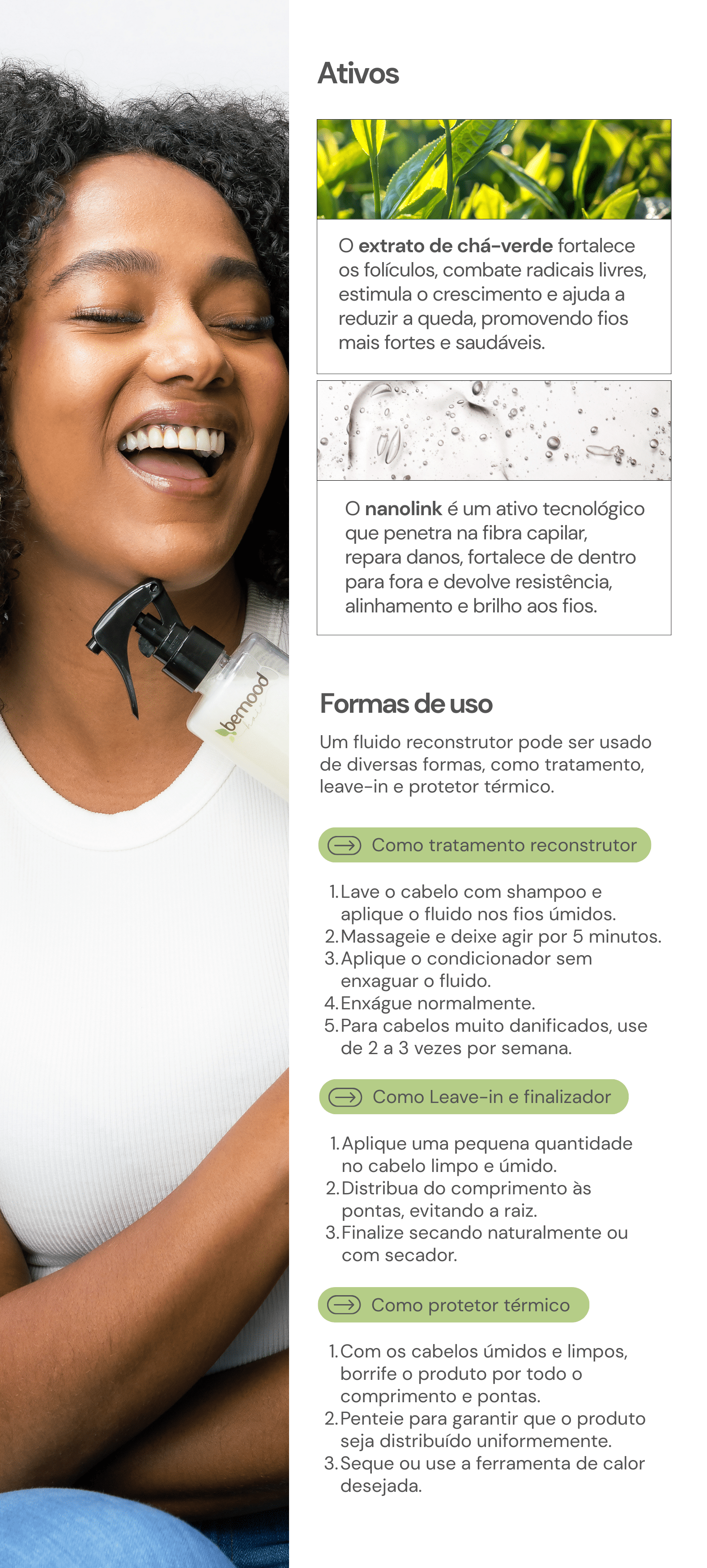 Finalização: Se usar secador ou prancha, o calor ativará a barreira protetora. Para secagem natural, age como um leave-in reconstrutor.